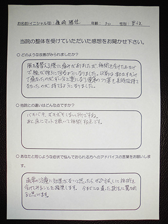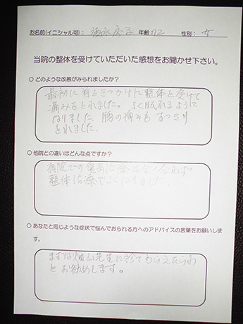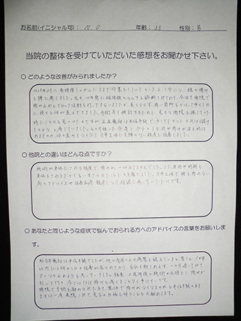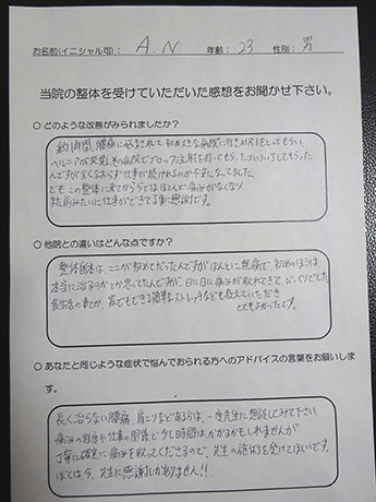 病院で改善しなかったヘルニアがとうとう改善! A・N様 20代 男性