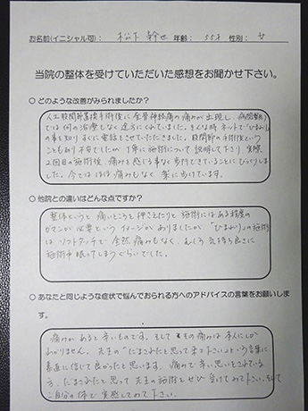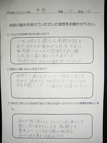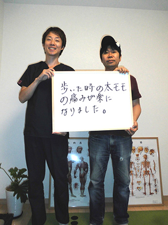 股関節の手術後ということもあり不安でしたが丁寧に施術について説明して下さり、実際2回目の施術後、痛みを感じる事なく歩行できていることにびっくりしました。