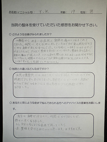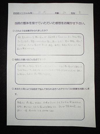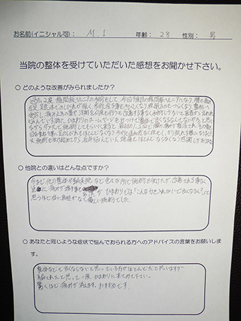 何度も繰り返す椎間板ヘルニアと頭痛も改善! M・I様 28歳 男性