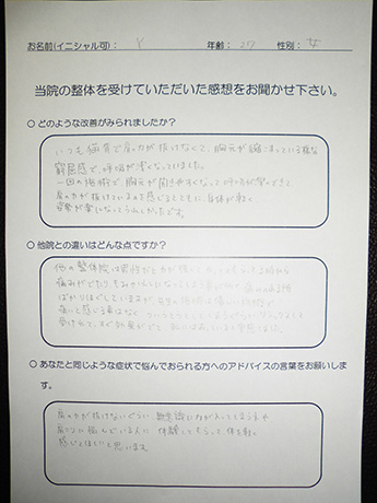 整体施術は初めてで、またマンションの一室ということもあり少し不安でしたが、施術自体はこんなのでほんとに改善するのかと半信半疑なくらい痛みのなく、楽な施術でした。