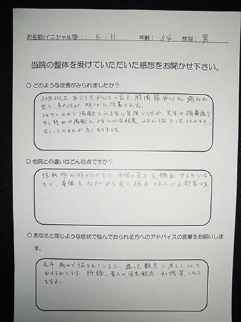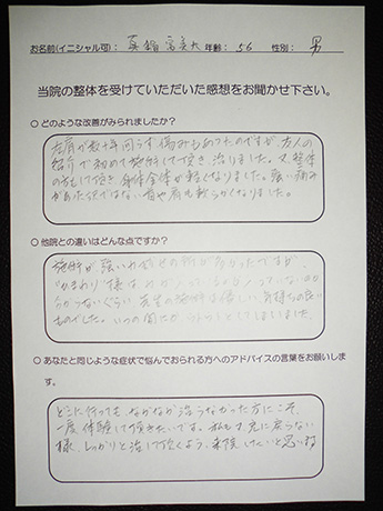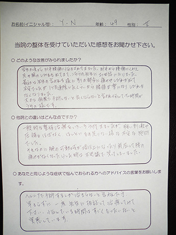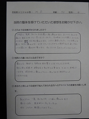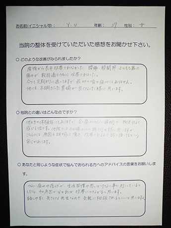 以前は、いつ症状が出るのか不安で、休日もなるべく外出せず、抑制的で憂鬱な日々を送っていましたが、こちらで整体を受けて、行動がアクティブに戻りつつあることを実感しています。