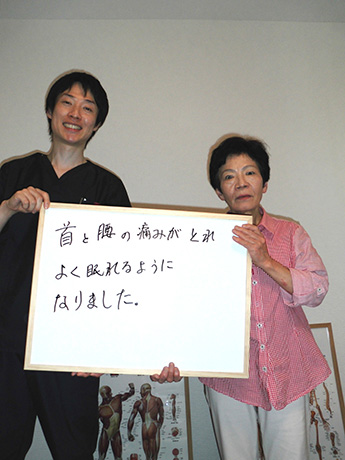 最初に首をきっかけに整体を受けて痛みが取れました。よく眠れるようになりました。腰の痛みもすっきり取れました。