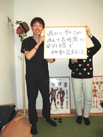 数年前に経験した坐骨神経痛がぶり返し、座る事が苦痛になっていた処に長時間の飛行機移動の予定が入り何とか改善しなければと思いこちらへ伺いました。