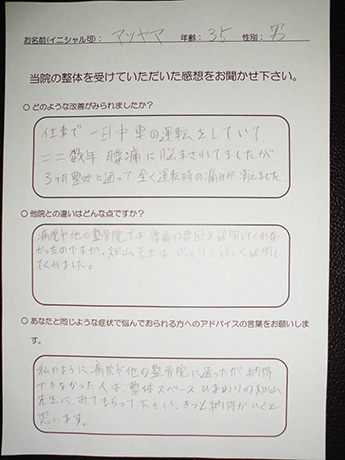 数年苦しんだ運転時の腰痛が消えた! マツヤマ様 35歳 男性