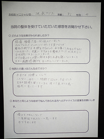 今回の施術では改善策を信じて継続することで、体の調子がよくなっているのを実感できたことです。
