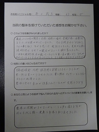 「めまい」施術に伺ったのに膝の痛みや腰のだるさなどが改善した事がよろこびです。