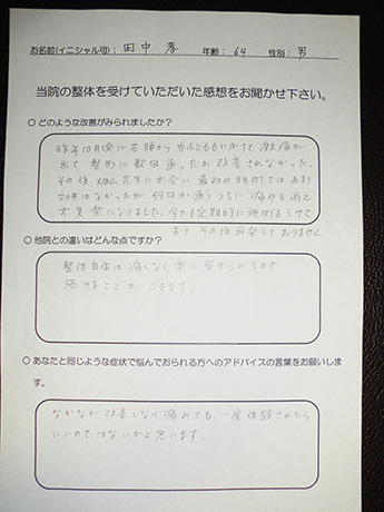右腰・右ふとももの激痛が改善! 田中孝様 64歳 男性