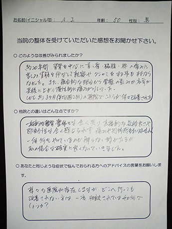でもこの整体に来てから今ではほとんど痛みがなくなり、また前みたいに仕事ができることに感謝です。