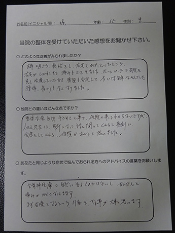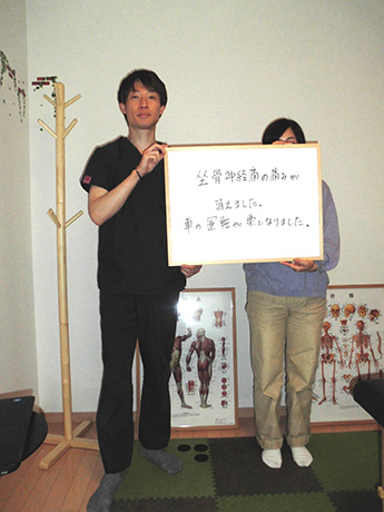 左肩から指先まで、1日に何度も訪れる痺れ。座ることも時折辛くなり、とうとう痺れのため、熟睡することさえ難しくなり病院を訪れましたが、原因がわからず「ストレス」の一言で片づけられ途方に暮れて、毎日を過ごしていたとき、目に飛び込んできた広告にワラをもすがる思いで、ここに来ました。