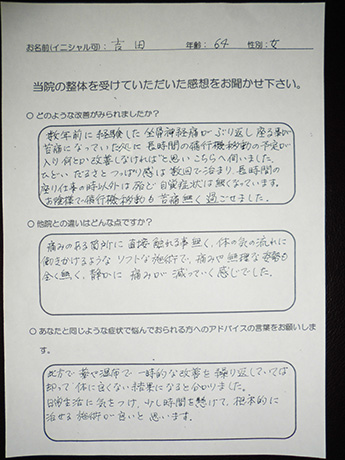 ぶり返した坐骨神経痛から解放! 吉田様 60代 女性